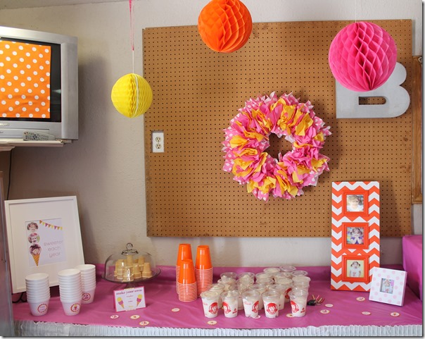 To the left of the main serving area is where we were going to have the frosty machine, but we had plan B instead and it worked out just fine! The pink & yellow napkin wreath is borrowed from my friend, Kim, from work (her daughter's party was pink & yellow last year).